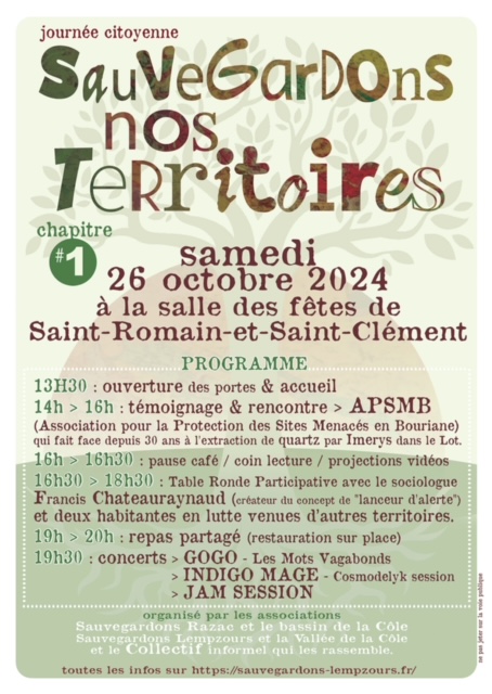 Les associations « Sauvegardons Razac et le bassin de la Côle », « Sauvegardons Lempzours et la vallée de la Côle » et le collectif informel qui les rassemble invitent toutes les personnes, collectifs et associations soucieux.ses du territoire à un après-midi d’informations, de rencontres et d’échanges. Cet évènement est le premier d’un cycle de journées thématiques : « HABITER, PRENDRE SOIN, SEMER LES GRAINES POUR DEMAIN ».