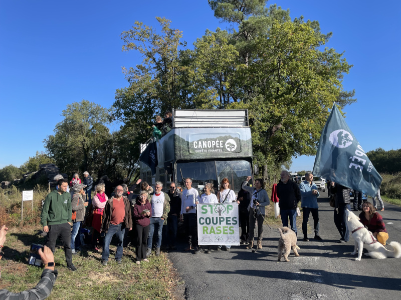 Là, les représentants des ETF et de la filière bois, prévenus du passage du bus, ont bloqué la route et ont vivement interpellé les personnes présentes pour empêcher Canopée de rejoindre SOS Forêt Dordogne. Après quelques échanges tendus, et un début de dialogue, la gendarmerie est intervenue pour rétablir le calme. Les véhicules ont été déplacés, et le bus a finalement pu rejoindre les Périgourdins qui attendaient près du chantier forestier.